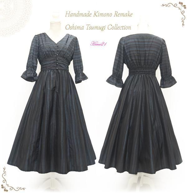 【大島紬】貴婦人風☆Vネックフレアーワンピース ロング丈/五分袖〈黒紺色・縞模様〉 着物リメイク★絹 100%*シルク  tsu1019